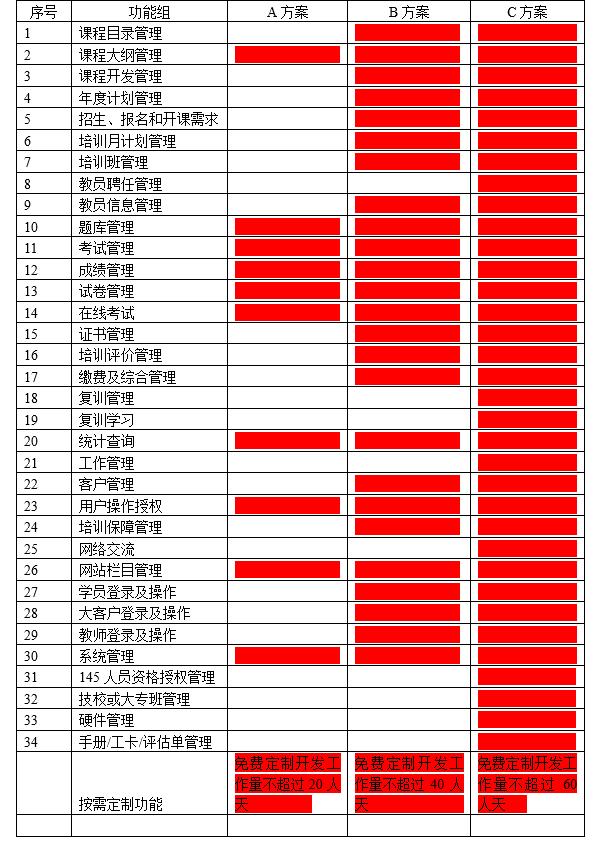 C方案:在方案B基础上,增加复训管理、远程学习、交流管理、手册/工卡/评估单管理、硬件管理、文件管理、工作管理、课程开发管理、教师聘任管理等。
